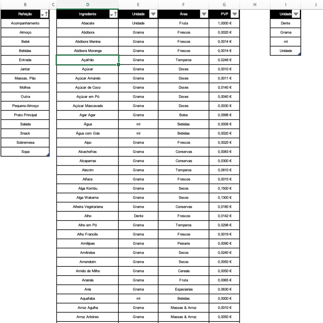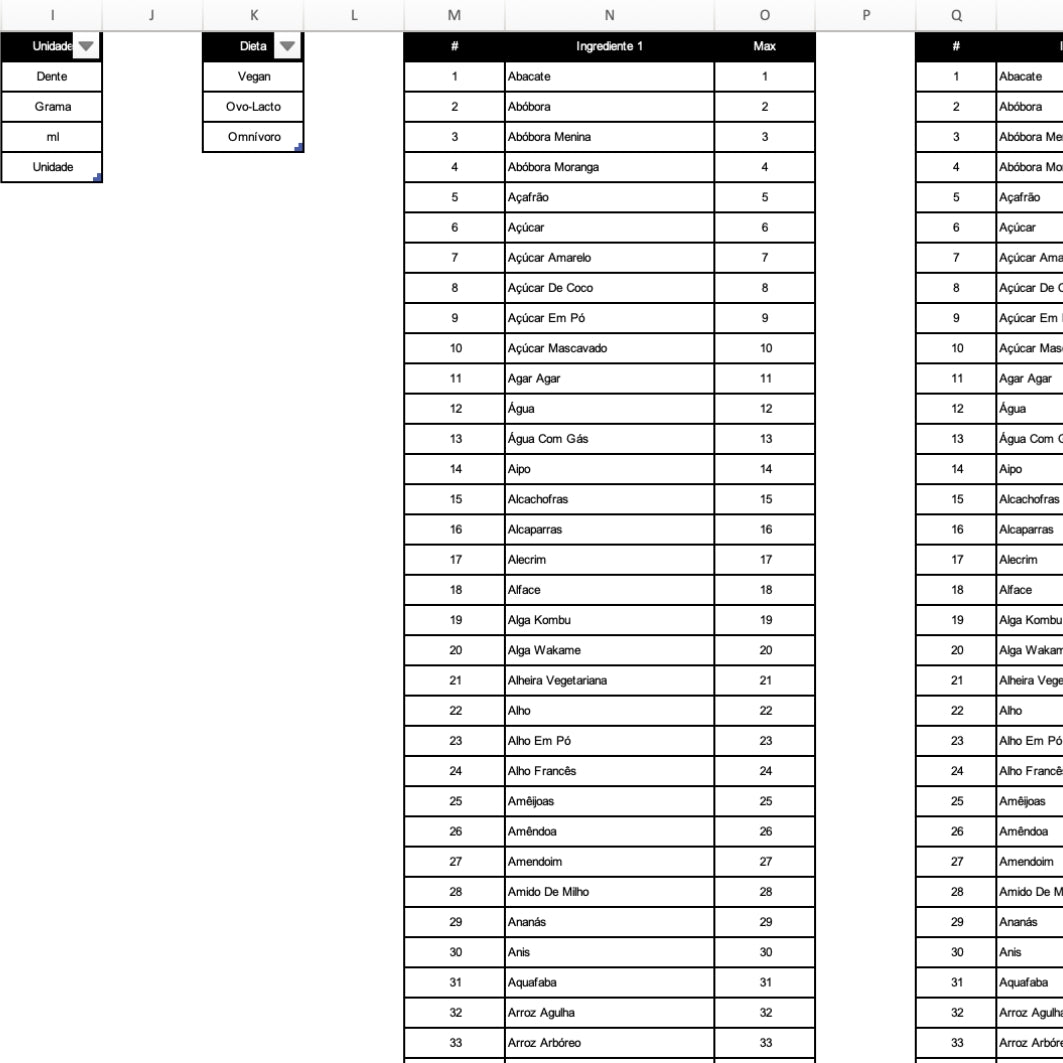 Neste Excel pode escolher as receitas, filtrando por autor, preço, tempo de preparação, tipo de alimentação e ingrediente.